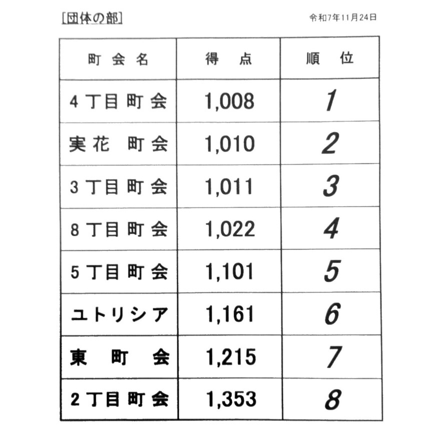 令和7年11月24日(月・祝)、「第22回東習志野連合町会パークゴル大会」がフレンドパークゴルフ習志野で開催されました。参加人数は、男子82名、女子35名の総勢117名の皆さんが、優勝を目指して頑張りました。団体戦優勝は東習志野四丁目町会、準優勝は実花町会、第3位は東習志野三丁目町会に決まりました。当番町会の東習志野5丁目町会の皆さんありがとうございました。来年度は、実花町会が当番町会です。